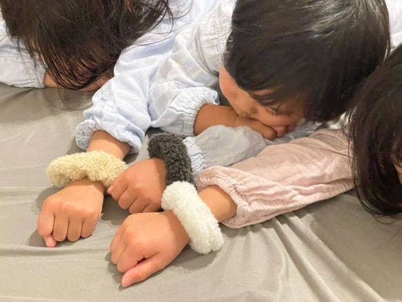 ・捻り二重に結ぶことはできないので、ヘアに使用する場合は通常のヘアゴムでセットした後に被せるようにお使いください。